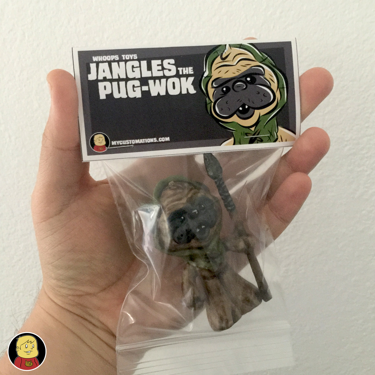 Jangles the Pug-Wok is a resin figure created by artist Cesar D. This figure was digitally sculpted using Zbrush, 3D printed and then casted in resin for the final product. Figure is hand painted using Citadel acrylic paints and then sprayed with a matte varnish for protection. Figure is approximately 3 inches tall.