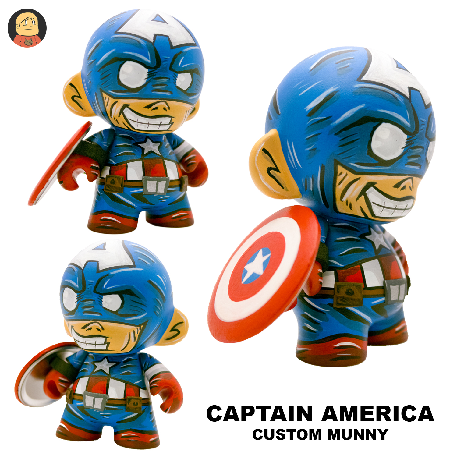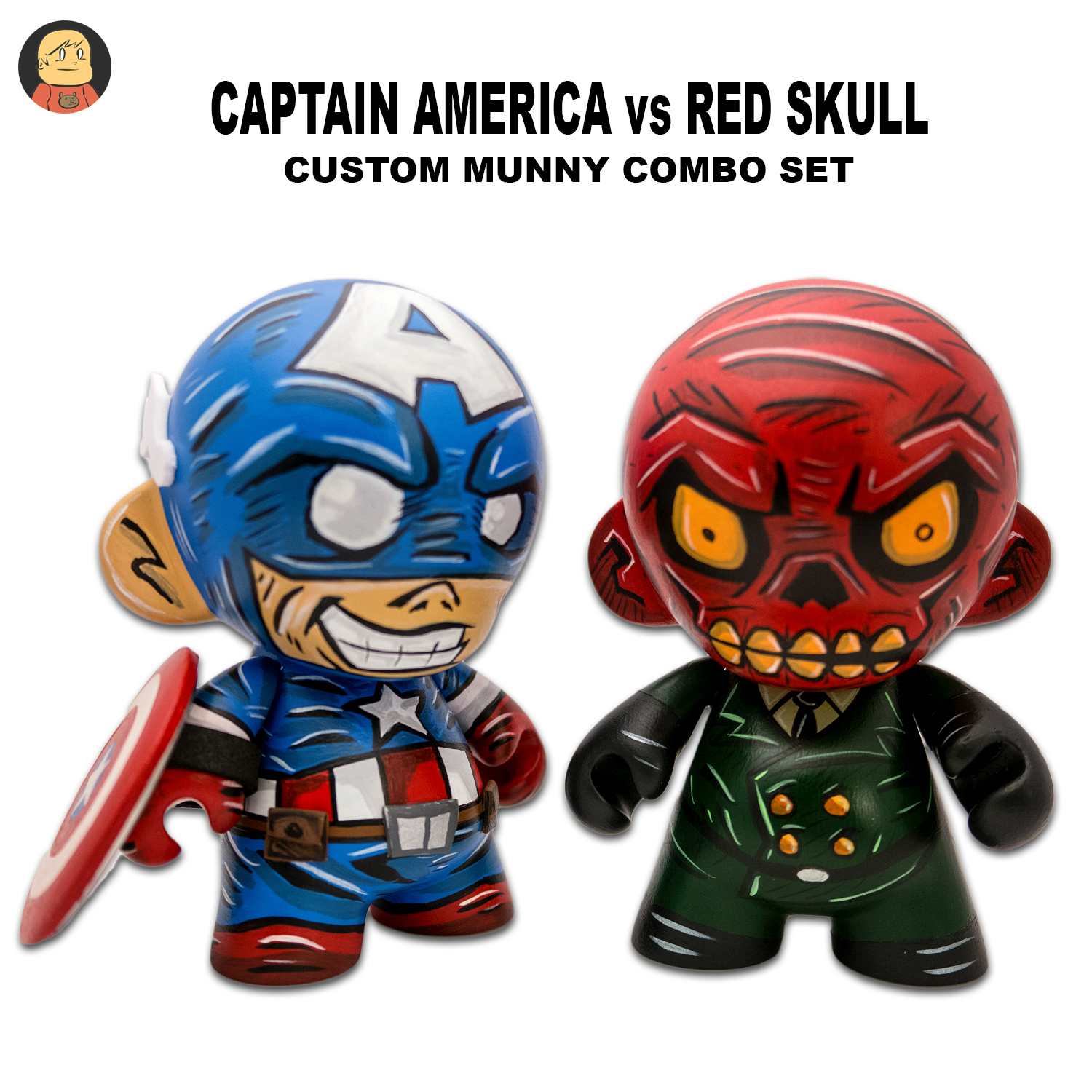 Captain and Red Skull are a custom Munny combo set hand painted using high end acrylic paints and then sealed with a matte varnish for protection. Each figure is 4" tall. Captain's shield is custom painted as well. This set is 1 of 1 so dont miss out on the opportunity to own it.